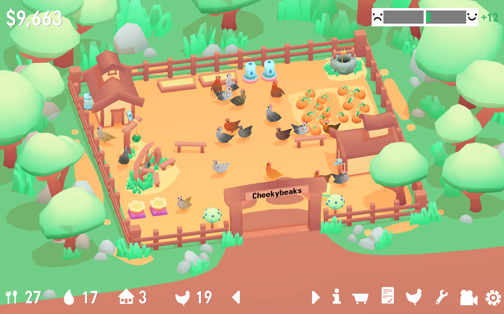 Cheeky Chooks – очень милый в своем исполнении и дополнил простой в оформлении игровой симулятор, где ты возьмёшь под свой контроль и управление маленькую ферму, стараясь всесторонне ее развивать. Главными жителями твоих владений станут маленькие цыплята, которым необходимо обеспечить счастливую жизнь. С самого начала тебе дается небольшой участок с маленьким домом для проживания птиц. Для того, чтобы было проще справляться с поставленной задачей, тебе даётся возможность пройти некое обучение, где ты узнаешь всю информацию по уходу за живностью. Потребности кур не так уж велики, но сил и затрат времени на это уйдет не малое количество. Каждой из курочек требуется питье, еда и насест, где она будет воспроизводить потомство или наделять тебя полезными яйцами. Курятник необходимо поставить для того, чтобы там курочки могли нести яйца в течении всего дня, а по его завершении уютно строится на ночлег. Чтобы улучшить свою небольшую ферму, ты будешь заниматься торговлей, аспекты деятельности которой также необходимо взять под полный контроль. За вырученные деньги ты будешь модифицировать свои владения так, чтобы курочкам было максимально комфортно жить.