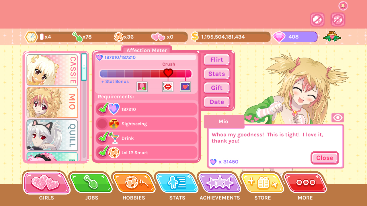 Crush Crush – увлекательный и позитивный игровой проект в жанре симулятора свиданий. Данная игра с лёгкостью сможет отправить тебя в красочный мир и подарить яркие эмоции. Хорошее настроение и заряд позитива тебе точно обеспечены на продолжительный отрезок времени. Здесь ты сможешь отправится на поиски красивой девушки, а затем сделать все возможное, чтобы завоевать ее сердце, любыми доступными и самыми безумными способами. Построй собственную статистику и с каждым разом повышай свои рейтинги. Ты должен постараться все не испортить и завоевать закрытое сердце возлюбленной. Старайся разблокировать как можно больше локаций, которые затем пригодятся тебе для проведения свидания. Отправляйся на исследование этого волшебного мира, приобрети различные подарки, которые сможешь потом подарить своей девушке. Разговаривай с понравившимися особами женского пола, старайся их как можно сильнее заинтересовать, дари всевозможные подарки, исполняй мечты, уделяй как можно больше внимания и только тогда ты сможешь добиться ее расположения к тебе. Все девушки разные, и к каждой необходим особый подход, поэтому заранее продумайте план своих действий. Повышай свою статистику, создай собственного героя и установи определенные параметры характера, а также отправляйся на работу.