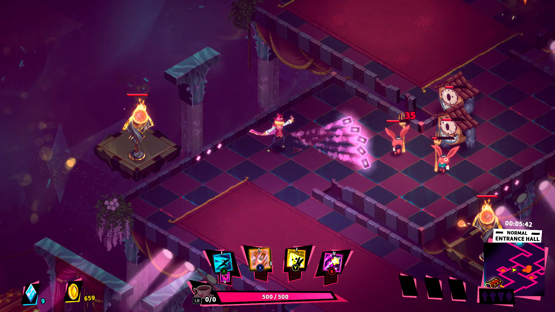 Dandy Ace – захватывающая игра, разработанная в жанре экшен, которая отправит нас покорять бескрайний мир фэнтези. Стоит сразу отметить главную особенность – это случайно генерируемые уровни, что сделает прохождение ещё более интересным. На протяжении всего игрового процесса нужно быть максимально внимательным, ведь каждая смерть равна потере всех заработанных навыков. Для игроков представлен богатый арсенал возможностей, которые позволят подключить полет фантазии на полную. Что касается линии сюжета, то она расскажет нам о главном герое по имени Дэнди Эйс, который является волшебником и фокусником. Дэнди отправляется покорять просторы довольно величественного и масштабного особняка с целью нахождения своего заядлого оппонента – Зеленоглазого иллюзиониста, над которым, во что бы это не стало, нужно одержать победу. Миссия не из простых и поэтому тебе нужно помочь фокуснику с ней справиться. На протяжении всего времени прохождения ты будешь изучать множественные, постоянно видоизменяющиеся локации, сталкиваться с немалым количеством врагов, а также стараться пополнить свой арсенал волшебными картами, способными увеличивать силу и могущество, что в конечном итоге приведет тебя к успеху.