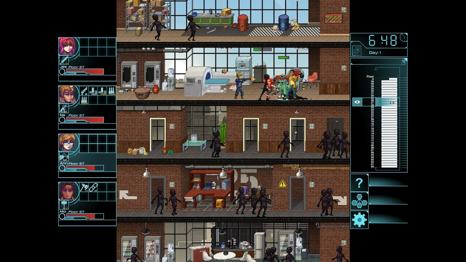 Highrisers – пиксельная игра, разработанная в жанре приключенческой РПГ с элементами выживания, где нам предстоит окунуться в фантастический мир и справиться с испытаниями, которые он для нас подготовил. Линия сюжета расскажет о внезапной вспышке неизвестного вируса, который стал со стремительной скоростью распространяться по миру, погружая людей в бесконечный сон, делая их похожими на бездушных зомби. Познакомься с командой друзей, которые оказались в самом центре заброшенного города вследствие крушения их вертолета на крышу небоскреба. Теперь команде предстоит выживать, проходить испытания и сражаться с врагами, которые особую активность проявляют в темное время суток, так как не любят солнечный свет. Такая особенность сыграет друзьям на руку, ведь именно днём они сумеют добыть необходимые ресурсы, пропитание и укрепление для укрытия. Всё действия происходят в здании небоскрёба, и чтобы суметь починить самолёт, команде предстоит добраться до нижних этажей, а это уже сделать будет крайне нелегко. Будьте на чеку, действуйте сообща, продумывайте план наперед и старайтесь избегать темных уголков, чтобы не стать очередной жертвой вируса.