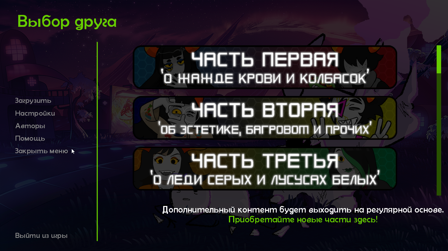 Hiveswap Friendsim – игровой проект, представленный в довольно необычном жанре эпизодического визуального романа, который успешно сумел сочетать в себе мрак и комедию. Ты отправишься в фантастическую вселенную, пространство которой тебе необходимо покорить любыми доступными способами. Но прежде чем пробраться к поставленной цели, ты должен пройти ряд испытаний, встречающихся на пути. Игровой проект включает в себя отличную в своем исполнении визуализацию, которая подарит тебе возможность стать частью красочного мира с его необычными жителями. Здесь также присутствует не менее привлекательная линия сюжета, обладающая неожиданными поворотами событий. Ты попадешь в суровую атмосферу жестокого мира, где твоя жизнь постоянно будет находится под угрозой уничтожения. Сосредоточься на основном действии, чтобы повернуть ситуацию в максимально выгодную для тебя сторону. Не забывай о том, что многие из твоих товарищей могут в любой момент стать предателями. Мрачный мир подготовил для тебя интересные, но в то же время очень сложные испытания, пройти которые будет очень непросто. Всегда стоит помнить, что от твоих действий и принятых решений будет зависеть исход событий, поэтому будь внимательным и развивай свой талант стратегического мышления.
