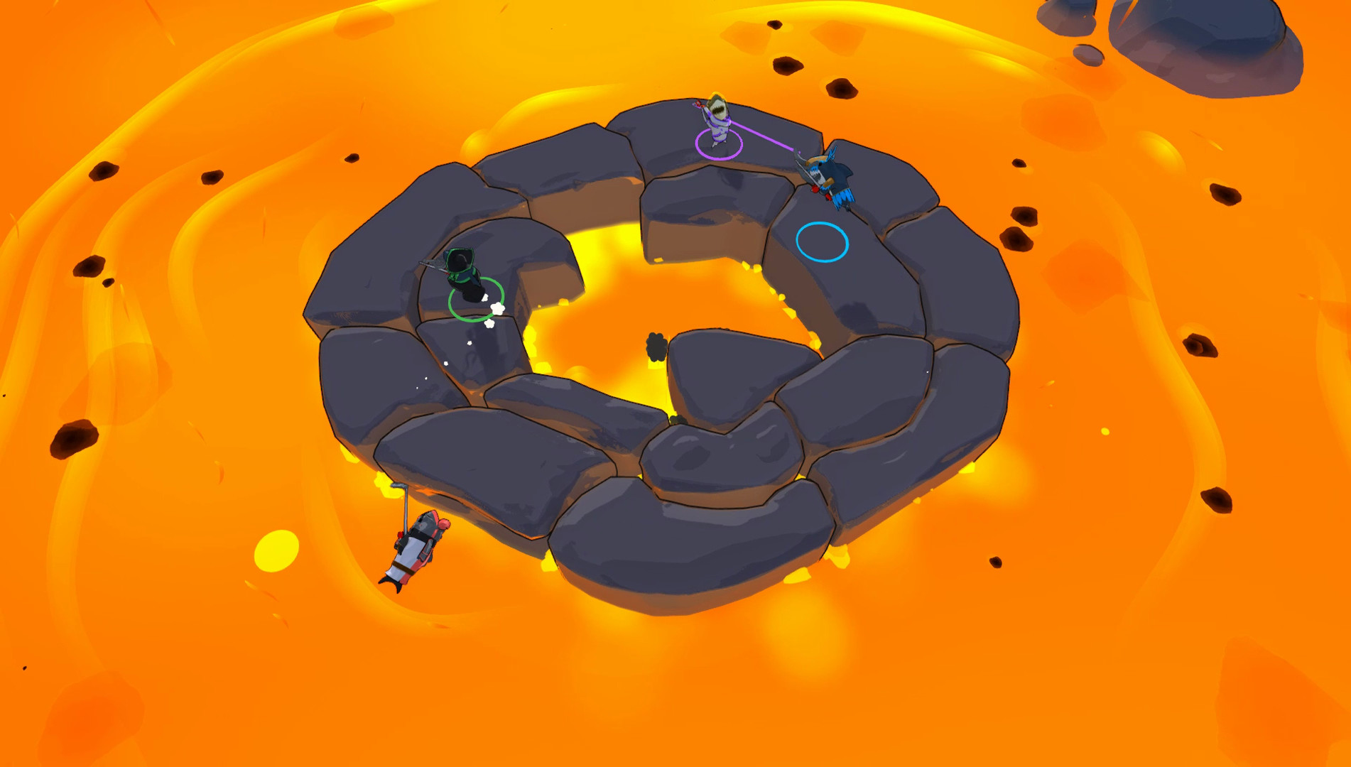 Last Shark Standing – увлекательная игра в стиле экшена, которая позволит тебе здорово провести время в компании друзей. Ты станешь частью динамичной рыбной вечеринки и постараешься всеми силами убрать с поля действия своих оппонентов. Игра позволит тебе проявить все свои рыболовные навыки, чтобы максимально эффективно справится с соперниками. Что касается механики, то она уникальна и готова подарить тебе увлекательное приключение. Другие игроки будут видеть твои планы и сумеют продумать свои действия наперед, чтобы тебя обхитрить. Будь всегда на чеку и не забывай, что враг не дремлет и готов в любой момент тебя уничтожить. Развивай свои навыки тактического планирования, чтобы суметь предугадать действия других участников игры и затем безжалостно из сбросить с арены. Схема управления разработана довольно просто, поэтому не вызовет у тебя совершенно никаких сложностей касательно прохождения. Лучше всего в данной игре использовать именно геймпады. Локальный мультиплеер включает в себя от двух до четырех игроков. Всего в игре шесть уникальных арен, каждая из которых наделена преградами и опасностями.