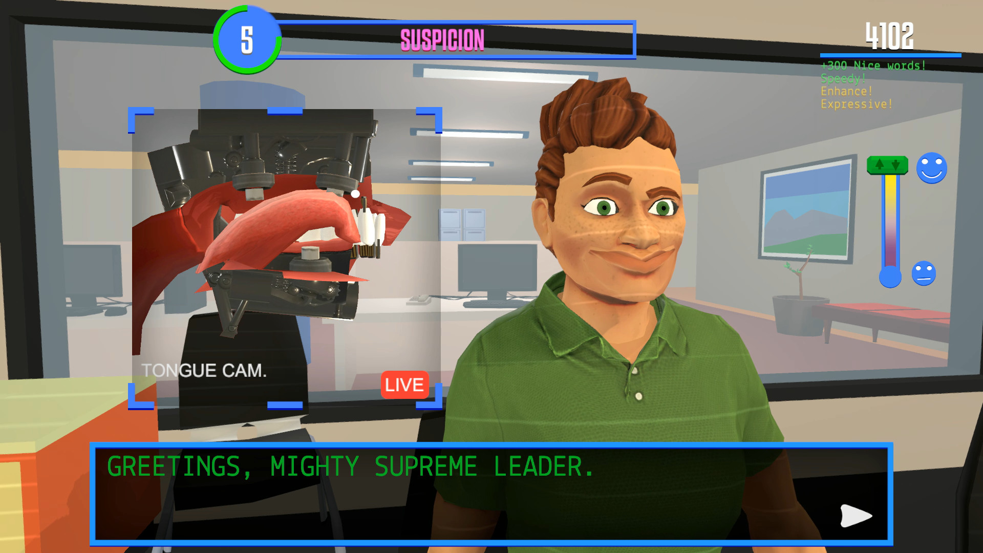 Speaking Simulator – игра, исполненная в жанре симулятора, основанная на физическом взаимодействии с окружающими миром. Твоя задача заключается в решении многочисленных головоломок, каждая из которых требует индивидуального подхода. Ты возьмёшься за исполнение роли робота, который всеми возможными способами будет пытаться стать полноценной частью человеческого общества, а сделать это, как оказалось, ее так уж и просто. В твоём распоряжении некий прототип языка и губ, которыми ещё предстоит научиться правильно управлять, дабы в дальнейшем не быть замеченным. Игра представляет собой некую аркадную головоломку с элементами симулятора, где тебя ожидает увлекательный, а порой даже очень весёлый игровой процесс. Задача таких, как ты заключается в захвате всего мира человечества. Чтобы совершить то или иное действие тебе нужно дотянуться во рту языком до определенной кнопки. Контролировать процесс будет сложно, но ты должен сделать все, чтобы твою настоящую натуру не заметили окружающие. Если ты потерпишь неудачу, то из твоих ушей вдруг повалит дым, глаза выскочат из глазниц, а уши повиснут на забавных пружинах.