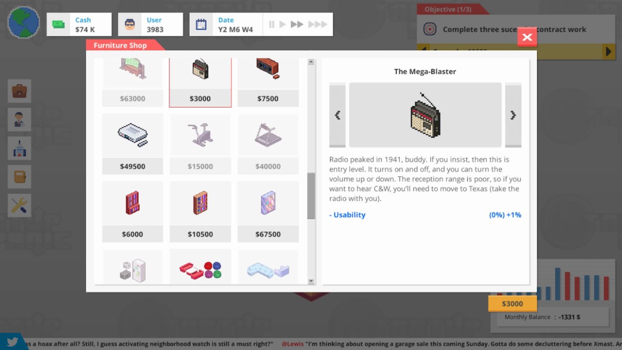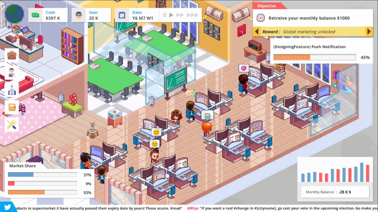 STARTUP PANIC – игровой проект, разработанный в жанре стратегического симулятора, где игрок отправляется на просторы красочного мира, чтобы справиться со сложной миссией. Возьмись за исполнение роли профессионального программиста, который собирается с нуля создать собственную компанию, развивая ее и модифицируя, делая самой популярной в мире. Задача не из лёгких, но при правильном расчете, ты точно сумеешь с ней справиться. Прояви навыки стратегического планирования, подключи смекалку, а в некоторых моментах и хитрость, чтобы оставить позади оппонентов, прорвавшись вперёд к мечте. Стоит отметить один из важных положительных аспектов игры – это полная свобода действий, которая позволит распоряжаться своим временем, так, как ты посчитаешь нужным. Нужно быть максимально внимательным, чтобы не допустить ошибок, которые имеют последствия. Берись сначала за простые, а затем за более сложные проекты, расширяй свой офис, нанимая профессионалов своего дела, расширяй клиентскую базу, добывай пассивный доход со стартапов, а также избавляйся от тех, кто попытается тебя остановить. Игра порадует многообразием возможностей и реалистичностью, созданной за счет общей атмосферы.