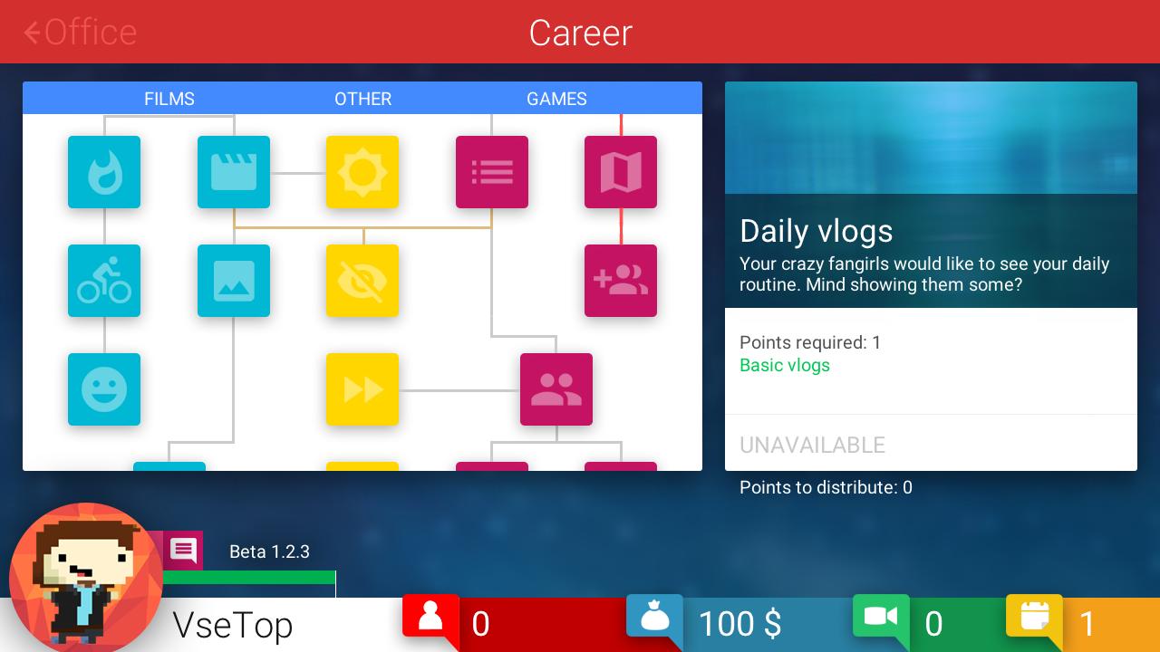 Tube Tycoon – крутой симулятор видеоблогера, где тебе предстоит в своем любимом деле зарабатывать огромные денежные суммы. Ты будешь постепенно набирать просмотры, делая качественный контент, тем самым пополняя свои денежные запасы все больше и больше. Твой успех будет зависеть только от тебя, поэтому следи за своими действиями и принятыми решениями, ведь даже малейшая ошибка может лишить тебя любимого дела. Здесь у тебя будет полная свобода действий, ведь ты сможешь самостоятельно принимать решение какого рода видеоролики снимать и как их продвигать в дальнейшем. Качество твоей работы будет зависеть от твоих действий, поэтому старайся делать все максимально правильно. Набирай как можно больше опыта и продвигать свой канал все дальше и дальше по лестнице карьеры, где, в конечном итоге, ты сможешь оказаться на самой вершине. У тебя будет более чем достаточное количество конкурентов, у которых тоже имеется определенная цель, поэтому ты должен вложить все силы в свое дело, чтобы они не могли тебе обогнать.